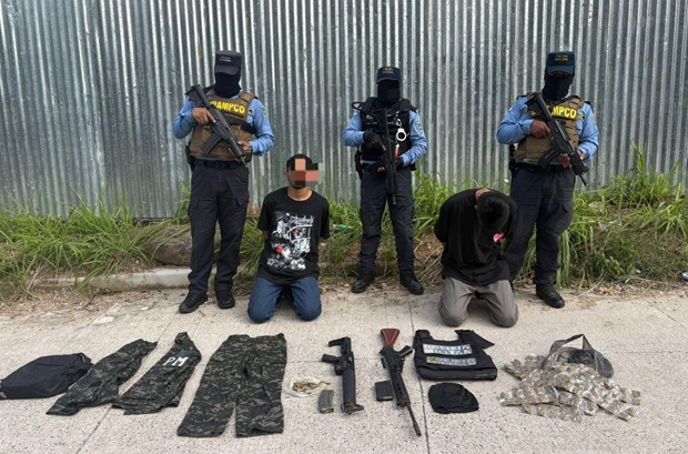 Tegucigalpa.- La Policía Nacional, a través de la Unidad Metropolitana de Prevención N.º 2 (UMEP-2), ejecutó un operativo en la colonia San Juan del Norte del municipio del Distrito Central, que resultó en la detención de dos presuntos integrantes de la estructura criminal Pandilla 18, por suponerlos responsables de diversos delitos relacionados con armas y drogas.