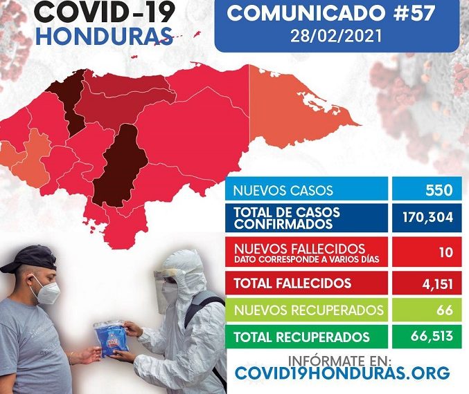 Tegucigalpa. Los casos de covid-19 en Honduras se elevaron hoy a 170.304 desde el inicio de la pandemia con la confirmación de otros 550 contagios, mientras que los pacientes recuperados aumentaron a 66.513, informó el Sistema Nacional de Gestión de Riesgo (Sinager).Continue Reading